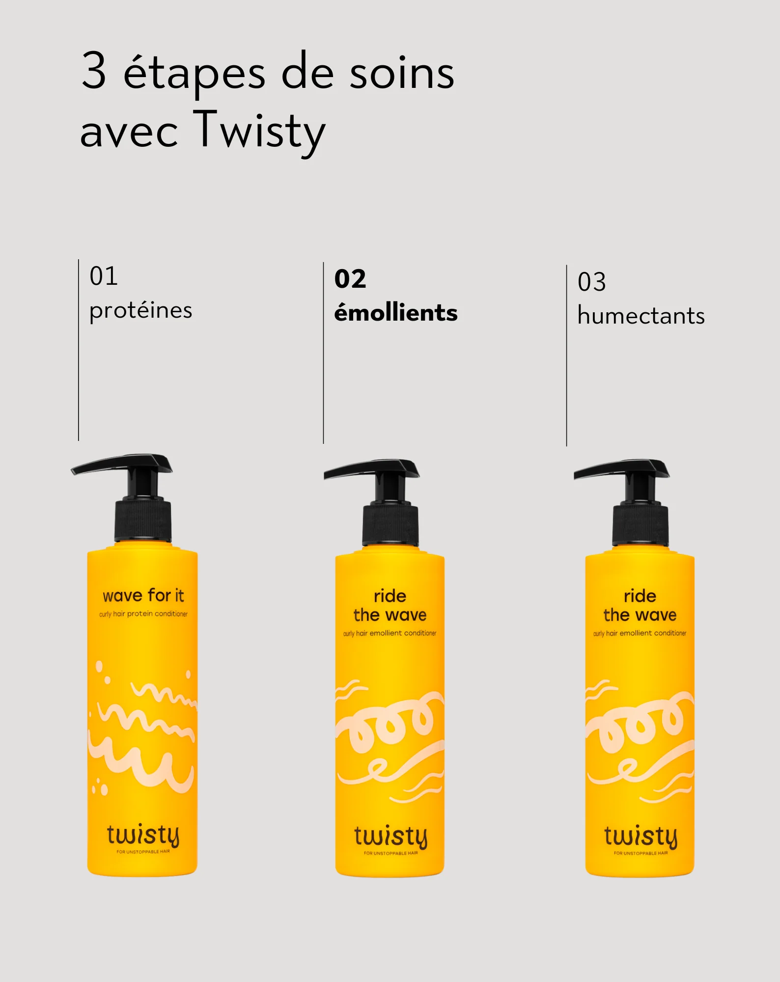 L'après-shampooing émollient pour cheveux bouclés Ride the Wave de Twisty est composé à 98 % d'ingrédients naturels. Il contient notamment de l'huile d'amande douce hydratante et de l'huile de chanvre, qui facilite le coiffage. Ce dernier ingrédient rend les cheveux plus doux et plus brillants.